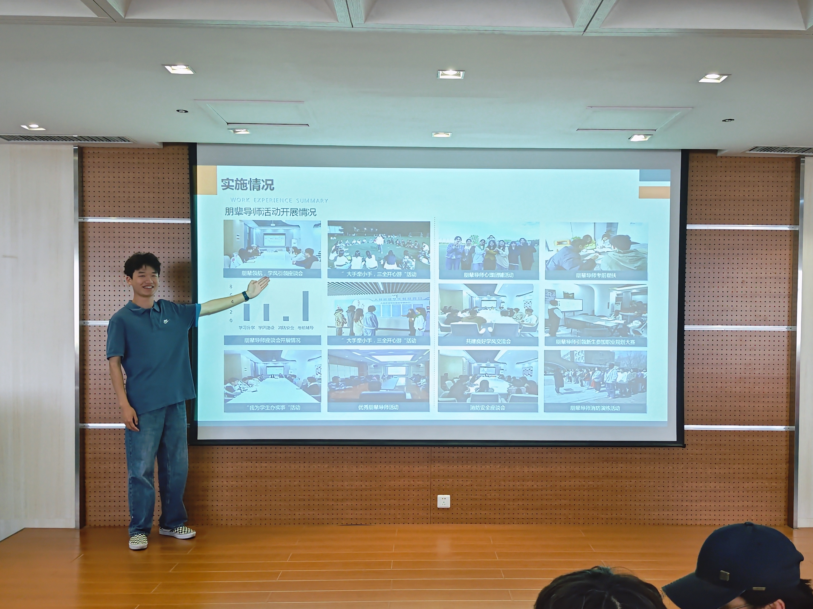 活动伊始,2023-2024学年的朋辈导师们依次进行述职,分享过去一年在新生引导、学业辅导、生活帮助、职业规划等方面的经验和成果。他们通过开展志愿服务、团体活动、经验分享会、交流座谈会等活动,为新生们提供了全方位的指导和帮助,使他们在陌生的大学环境中感受到了家的温暖。