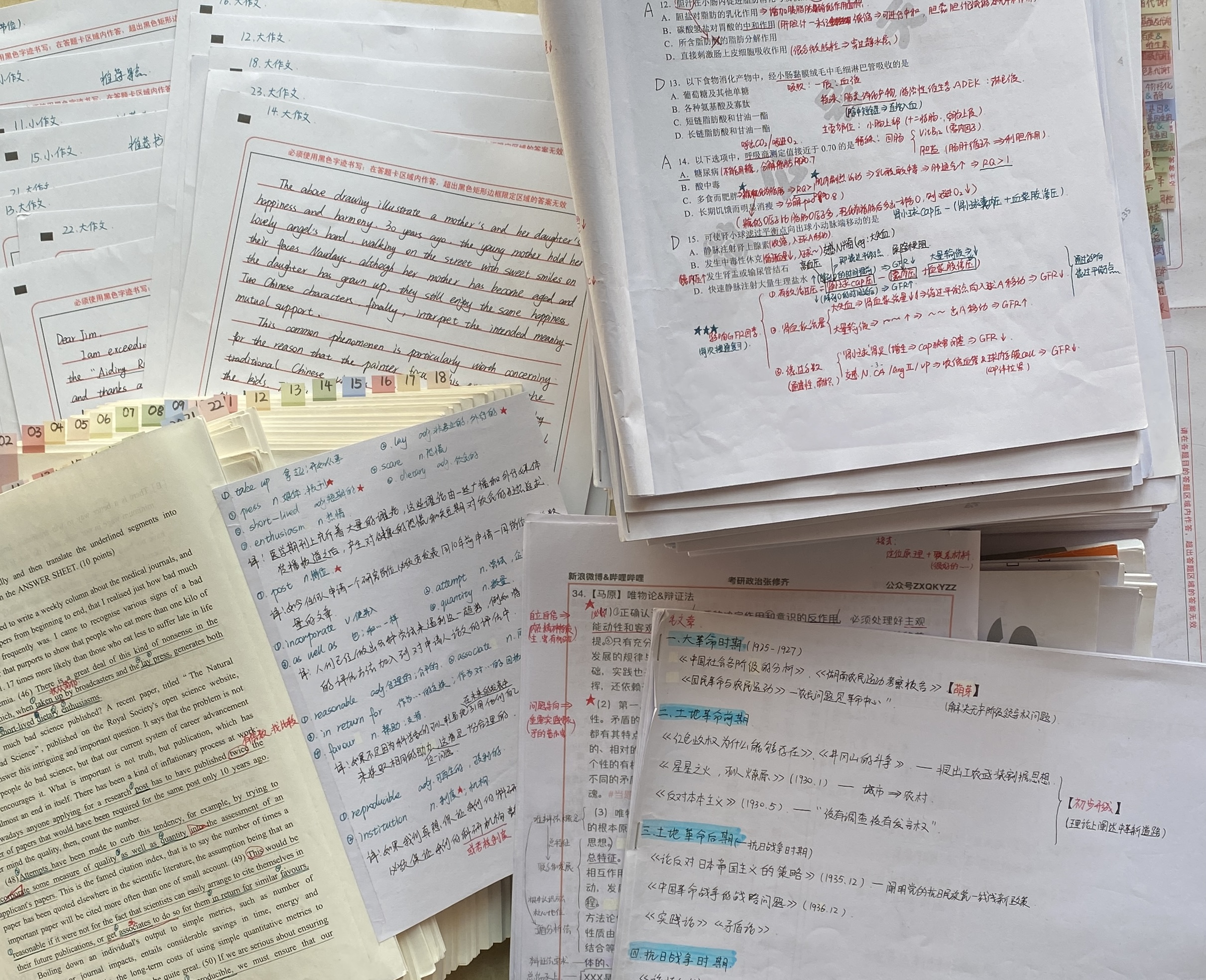政治:前期选择一个喜欢的老师看一遍课,同时刷一下选择题巩固知识点,后期选择题方面要高质量完成模拟题(例如肖四肖八等)。题目只是考察的形式,重点要了解清楚题目涉及的知识点,换一种提问方法或者考察另一个选项自己是否还能给出正确答案。客观题方面后期很多老师都会押题,相比较背题目我更喜欢背知识点,就比如肖四的客观题中也有重复的考察内容,所以也有很多老师直接整理知识点背诵,我选择的是张修齐的十页纸。不过无论是直接背题还是背诵知识点,这些都是积攒语料的过程,让我们在考察到相关内容时能够言之有物,不至于无从下笔,至于选择哪种形式就看个人喜好。