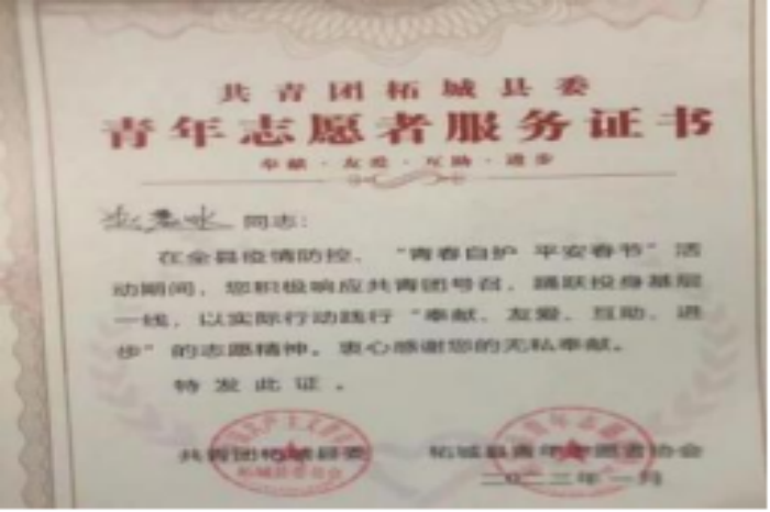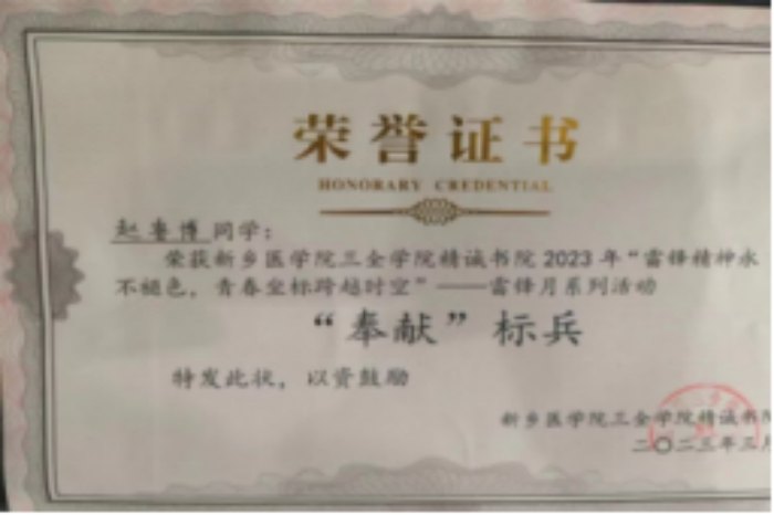 该团支部成员在2023年雷锋月志愿服务中,积极参与志愿服务活动,服务师生,被书院授予“奉献”标兵称号;支部成员在疫情防控时期,荣获“抗疫优秀志愿者”。