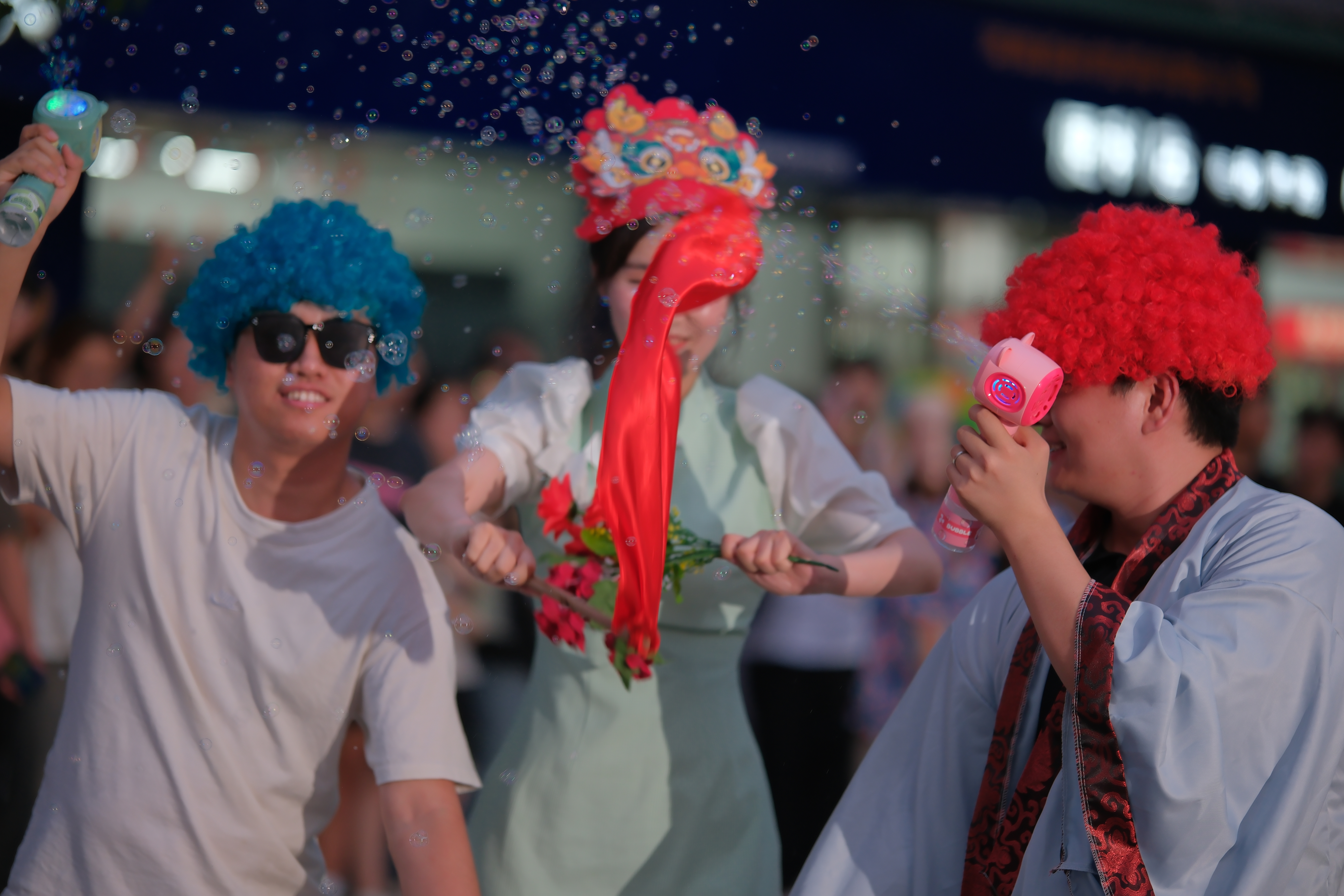 随着动感十足的音乐响起,师生代表瞬间化身“超级麻豆”,演绎创意走秀《笑料时尚秀,步态也疯狂》,他们身着自己DIY的服装和道具,一时间,民族、时尚、多巴胺、古风、二次元、COS、文艺......各美其美、美美与共,彰显了青春和活力,演绎着夏日傍晚最美好的浪漫。
