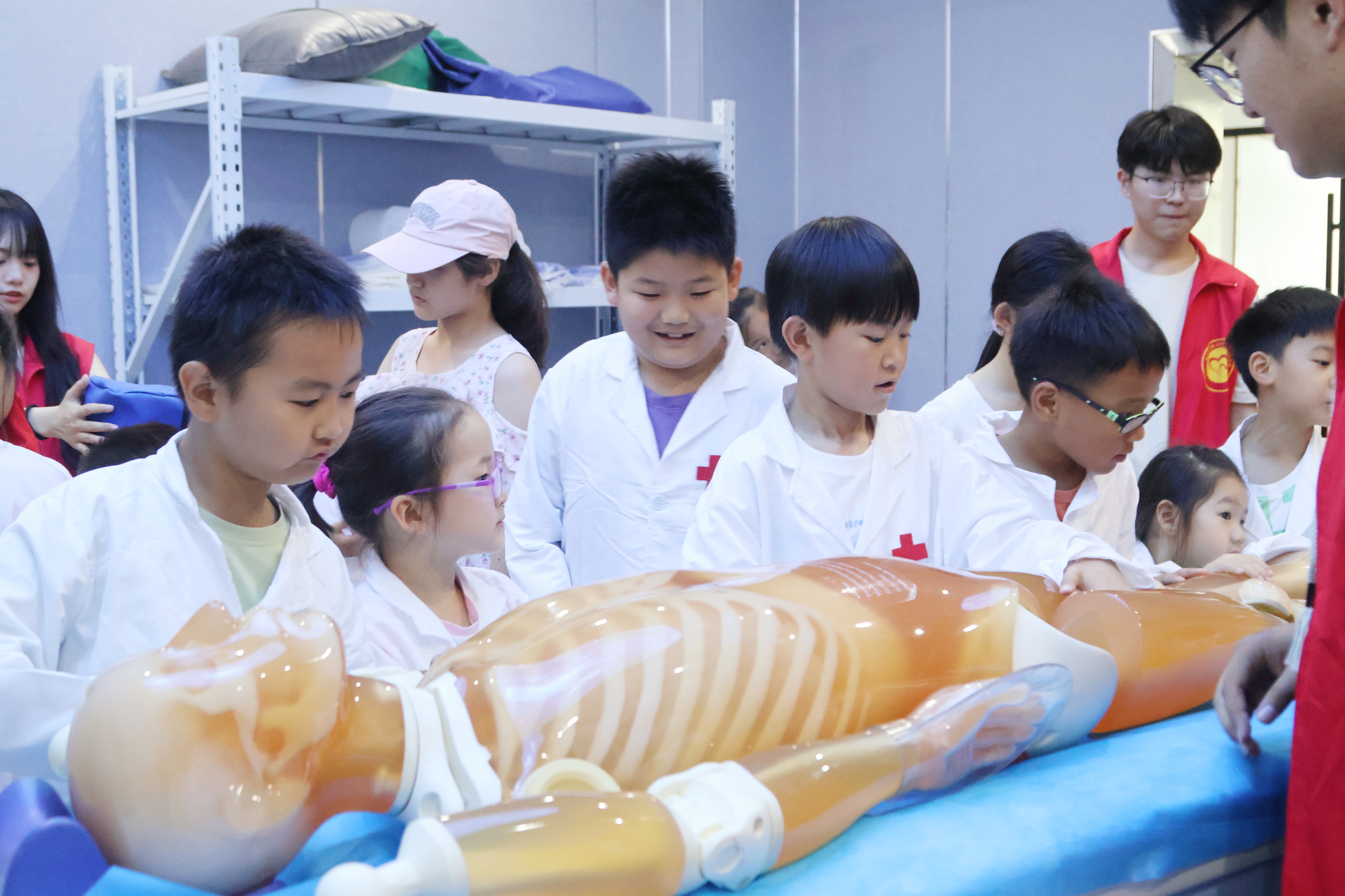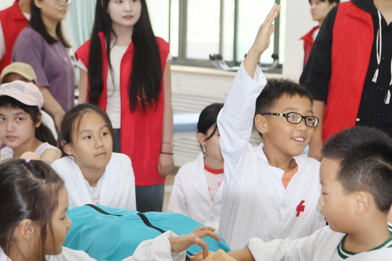 随后,在康复医学院,志愿者化身“小讲师”,为“小医苗”们讲解了海姆立克急救法、心肺复苏等医学急救常识。宣讲中,“小医苗”们学习了心肺复苏的基本知识和操作技能,了解了在紧急情况下,如何进行自救和互救,提高了他们的安全意识和自救能力。大家认真听完志愿者的讲解后,跃跃欲试,争先恐后进行心肺复苏等急救实践。