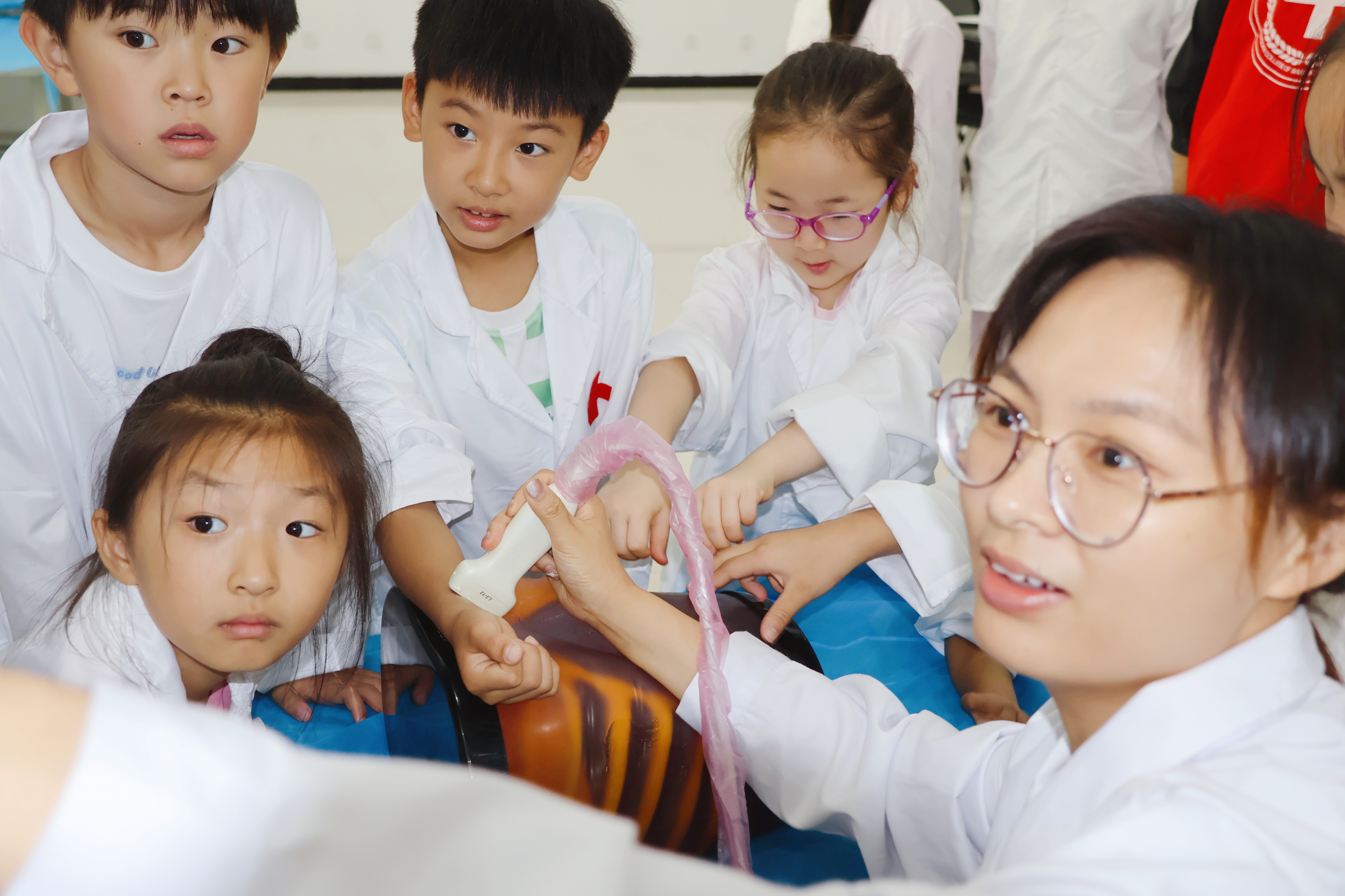 在医学影像学院,各种“高大上”的仪器激起了孩子们强烈的好奇心,提问不断。在志愿者的讲解和协助下,“小医苗”们自己动手操作实验仪器,饶有兴致地参观了MRI、CT和DR等实训室。紧接着,医学影像学院焦淙汇耐心的为孩子们进行了超声实验仪器的示范讲解,展示了腹部主要器官的影像形态和手臂上动静脉的走形及位置。“小医苗”们听得津津有味,不时发出:“太神奇了!”、真是“耳闻不如一见,一见不如实验!”的感叹。