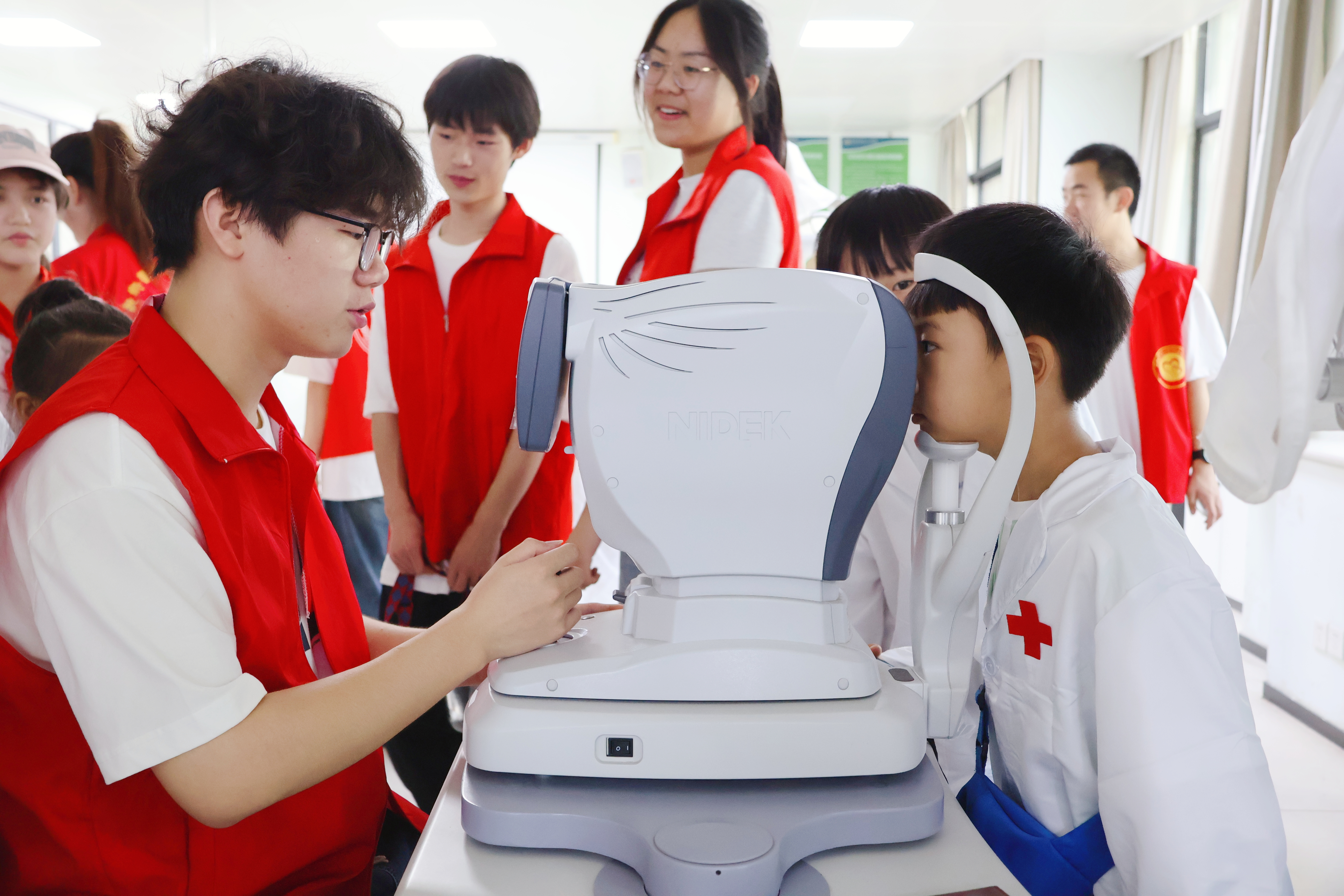 首先,“小医苗”们来到了光明眼科学院实验室。在这里,通过志愿者的讲解和互动体验,他们了解了眼睛的构造和工作原理、近视的成因和危害以及具体防控措施,并进行了视力测试,学习了正确的用眼姿势和习惯,为保护视力打下了坚实的基础。“小医苗”们兴奋地尝试了各种视觉测试设备,对眼科医学产生了浓厚的兴趣。