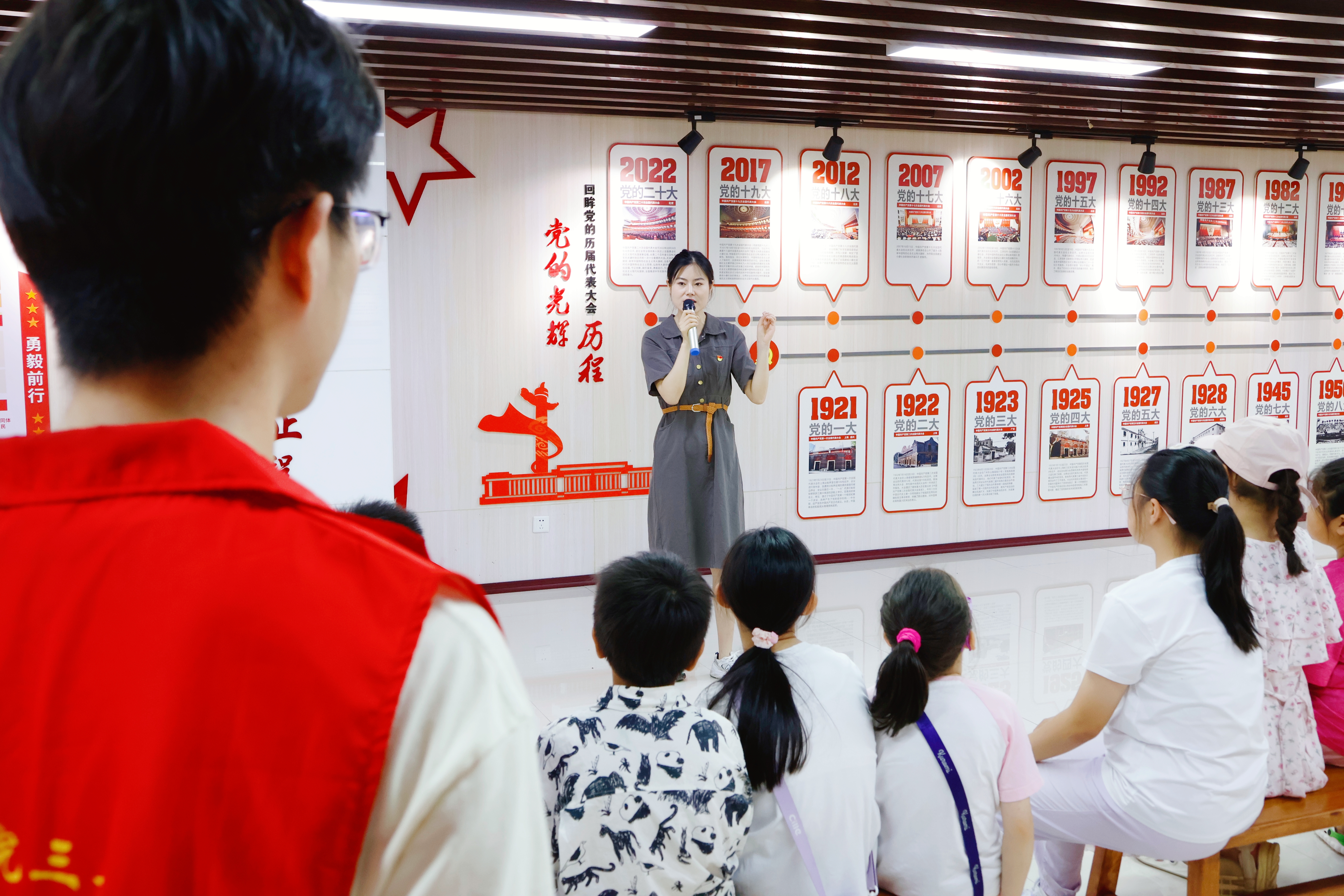 在我校新时代学习馆,马克思主义学院王桃金带领“小医苗”们进行参观,以“童言童语”的形式,讲解了从党的一大到党的二十大中,作为“伟大节点”和“时代坐标”的光辉历程,让孩子们发自内心增强对党的政治认同、情感认同和实践认同。紧接着,精诚书院学生团总支副书记兼“青马班”班长杜文凯与小学生们进行交流互动,抛砖引玉式谈及“入队、入团、入党三部曲”,用小学生听得懂的“时代语”、看得见的“身边事”、接地气的“活教材”为大家上了一堂微团课,团结带领广大青少年儿童坚定不移听党话跟党走。