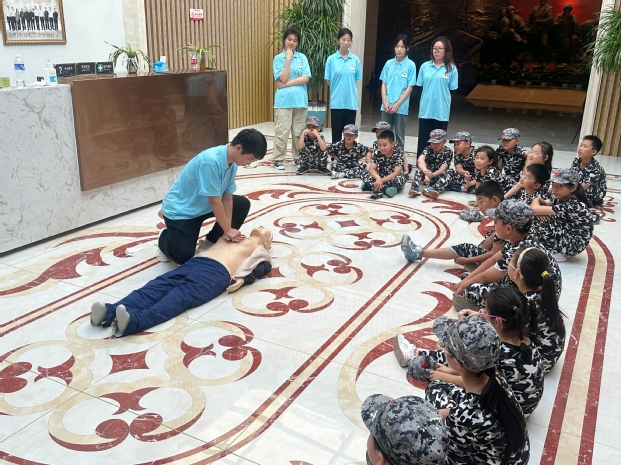 “野外作战时,受地理环境因素、医疗条件缺乏等多重不利因素的影响,需要掌握基本的急救技能以脱险。”蔡晨洁边操作示范边说,她从应急救护“黄金四分钟”入手,给进行战地训练的小学生强调了学习心肺复苏急救知识的必要性,并利用急救模拟人开展介绍心肺复苏的操作流程,包括确认环境安全、判断呼吸和意识、呼救、调整病人体位、胸外按压、开放气道、清除异物、人工呼吸等心肺复苏模拟救护步骤。