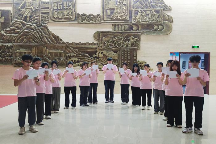 接着,在队长杨宇哲的带领下,大家集体朗诵《党旗飘飘》,“听着歌声成长,凝望红旗长大,过着甜蜜生活,挽着幸福走路。我是快乐的“山顶洞”后人。当我举起铁拳,站在党旗下,那是一种庄严,那是一种神圣,那是一种荣光。是党旗叫我有远大的理想,是党旗给我坚定的方向......”同学们时而娓娓道来,深情歌颂;时而致敬英雄,感人肺腑;时而铮铮誓言,激昂振奋。
