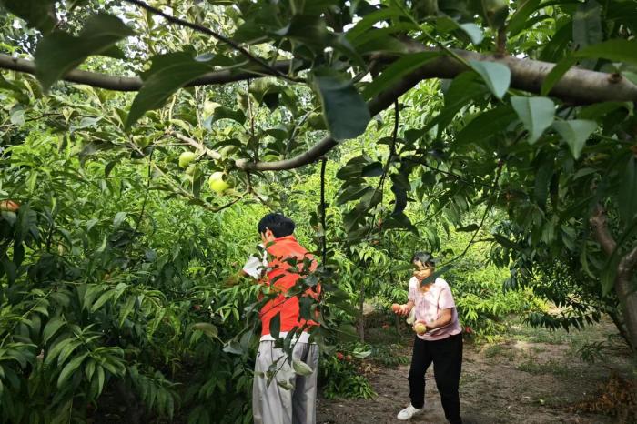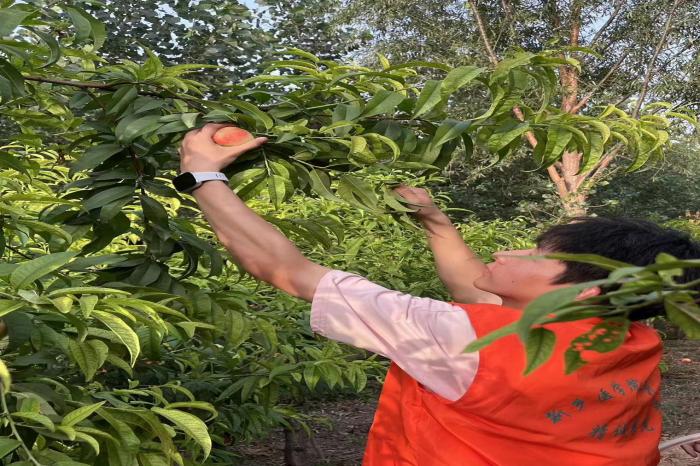 在农户的悉心指导下,同学们迅速掌握了摘桃的技巧和要领。他们小心翼翼地将成熟的桃子从枝头摘下,轻轻放入篮中,生怕碰伤了这些鲜嫩的果实。尽管汗水湿透了衣衫,但同学们的脸上始终洋溢着欢快的笑容,把劳动践于行动,为乡村振兴助力青春力量。