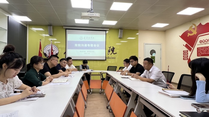 9月12日,精诚书院与康复医学院在康复医学院一楼会议室展开双院沟通会议,康复医学院院长袁志垚、精诚书院党总支副书记万建苗及书院教师代表参加会议。会议伊始,万建苗表示精诚书院本届新生全部来自康复医学院的学生,希望在本次交流能够共同推进双院制的建设和学生的培养,接着反馈学生的相关问题和学业导师配备等问题。袁志垚对提出的问题进行回答:本年度将持续关注学生的学习问题,就业前景问题,并开展相关考研讲座,引导学生进行考研,帮助其树立正确的学习观。
