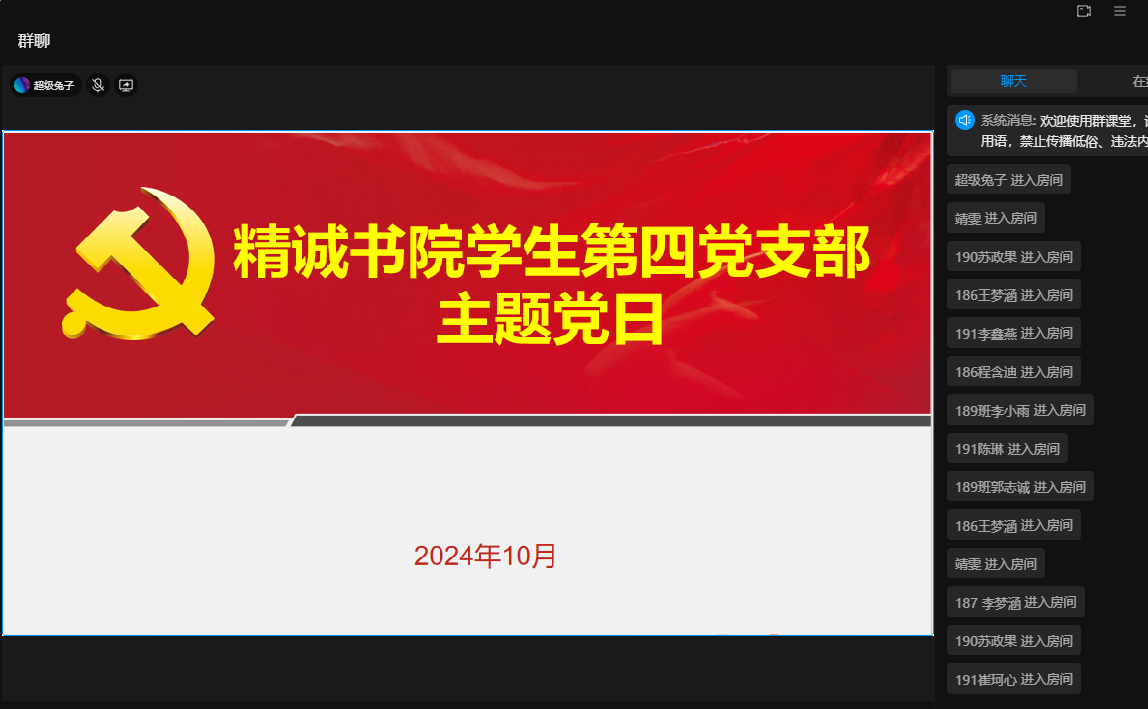 10月20日,精诚书院学生第四党支部在线上开展了《“75年披荆斩棘,75年风雨兼程,75年砥砺奋进”——热烈庆祝中华人民共和国75周年华诞》主题党日活动,本次活动由党支部书记秦磊主持,支部全体党员参加。