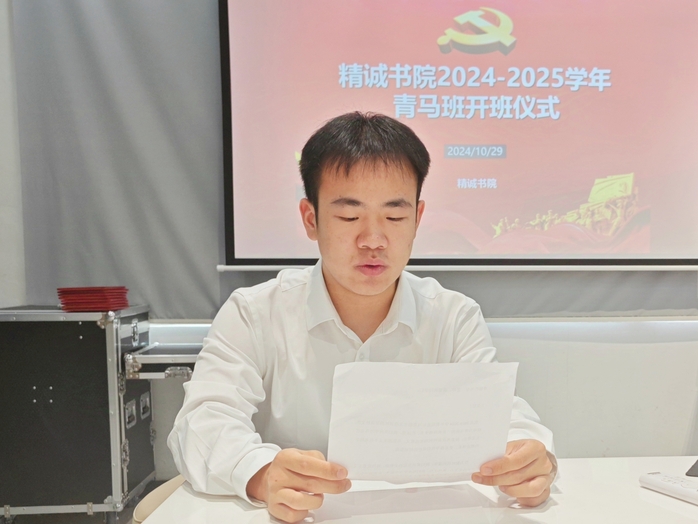 为深入学习贯彻习近平新时代中国特色社会主义思想,贯彻落实党的二十届三中全会精神,坚持用党的创新理论引领青年,为党培养信仰坚定、能力突出、素质优良、作风过硬的大学生政治骨干,10月29日,精诚书院于书院党团之家举行2024-2025学年“青年马克思主义者培养工程”培养班开班仪式。精诚书院团总支书记金潇,辅导员郝裴、李豹、齐盼君,行政专员朱家乐及青马班全体学员参加了此次开班仪式,会议由李豹主持。