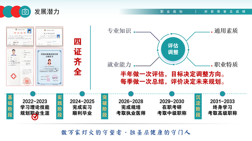 为成为一名优秀的基层全科医生,任新雨将职业规划分为不同的阶段。现阶段,目标是在毕业后,完成规培并顺利结业,考取执业医师资格证。直至四证齐全后,回到家乡工作,正式成为一名基层全科医生。此外,任新雨也将采取分阶段进行评估和调整,以确保我能够如期达成职业目标。