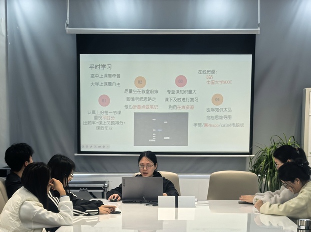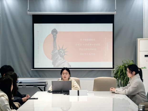 座谈会上,首先,赵茜茜分享了自己的学习经验。她强调了时间管理和自律的重要性,并详细介绍了自己如何高效利用课余时间进行自主学习和科研活动。她还鼓励大家要勇于尝试新事物,不断挑战自我,以积极的态度面对学习和生活中的困难。