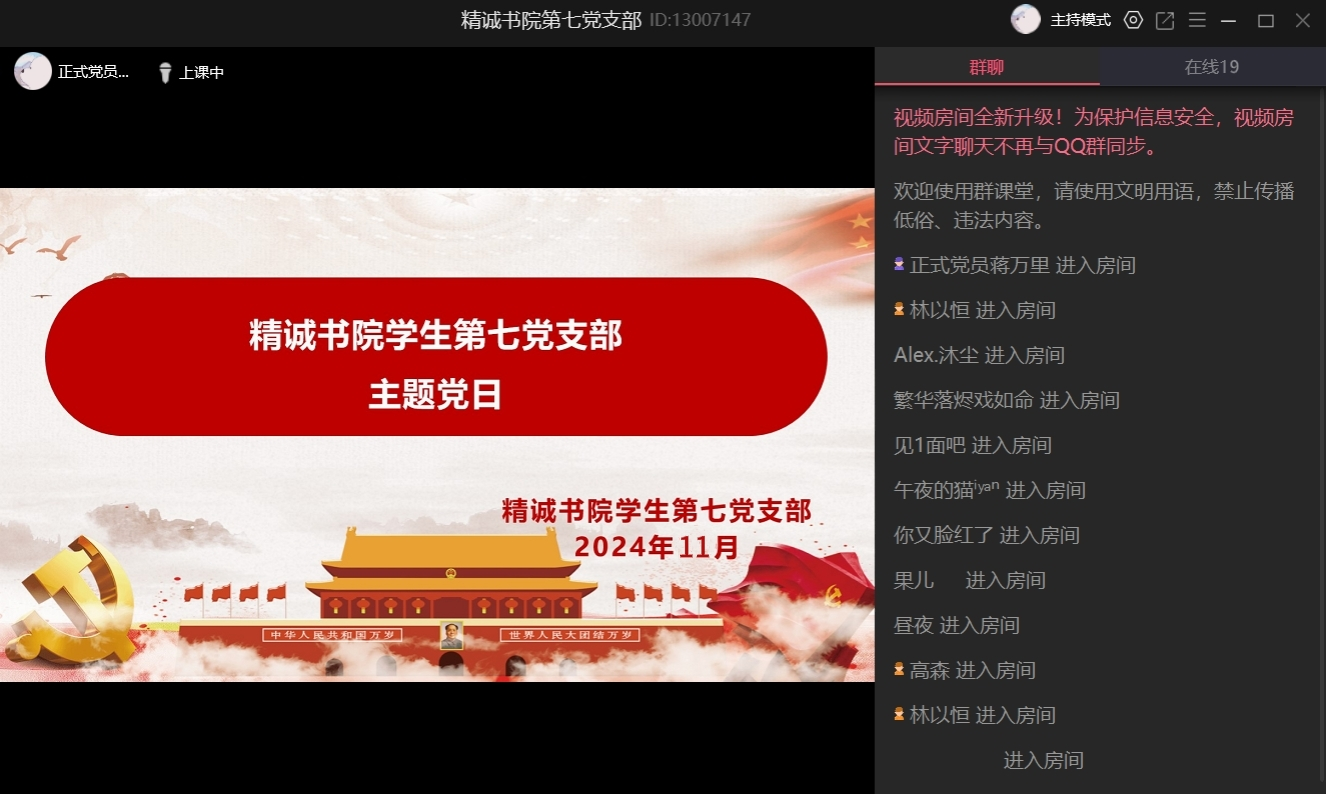 为学习贯彻习近平总书记在全国民族团结进步表彰大会上的重要讲话精神,弘扬爱国主义精神,铸牢中华民族共同体意识,11月8日,精诚书院学生第七党支部在线上开展了《弘扬爱国主义精神 筑牢中华民族共同体意识》主题党日活动,活动由支部书记蒋万里主持进行,支部全体学生党员参加。