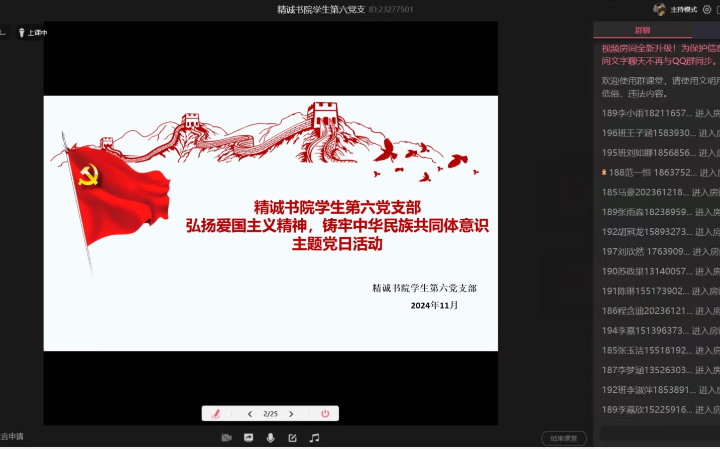 11月22日,精诚书院学生第六党支部在腾讯课堂开展了《弘扬爱国主义精神,铸牢中华民族共同体意识》主题党日活动。会议由党支部书记郝裴主持,支部全体学生党员参加。