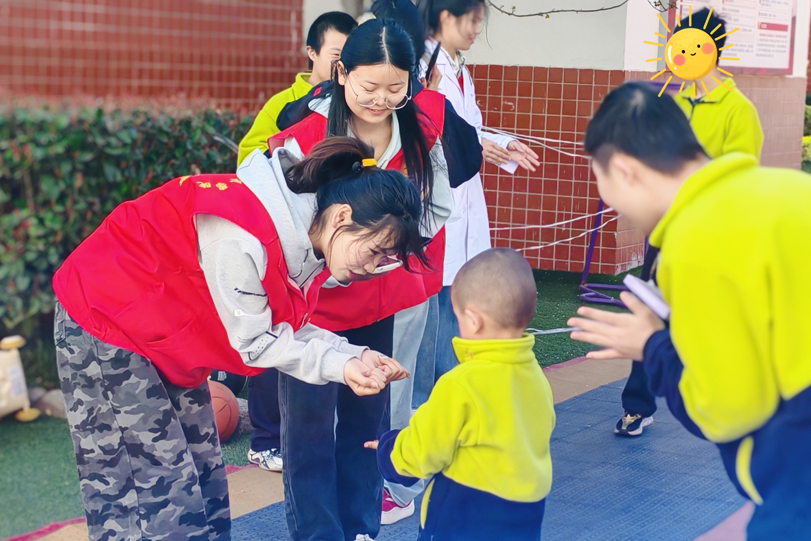 “手牵着手,传递美好和力量;生生不息的希望,会穿越时光......”熟悉的《把未来点亮》旋律响起,但这次演绎的是一支特别编排的“海姆立克手势舞”。志愿者李梓涵带领孩子们用肢体语言诠释急救知识,数十双小手划出的弧线,宛如春日里破茧的蝴蝶。“原以为教会特殊儿童跳舞是场挑战,却意外解锁了比解剖课更珍贵的‘高光时刻’,那些在《系统解剖学》里背过千百次的神经反射弧,突然有了最生动的注解。”