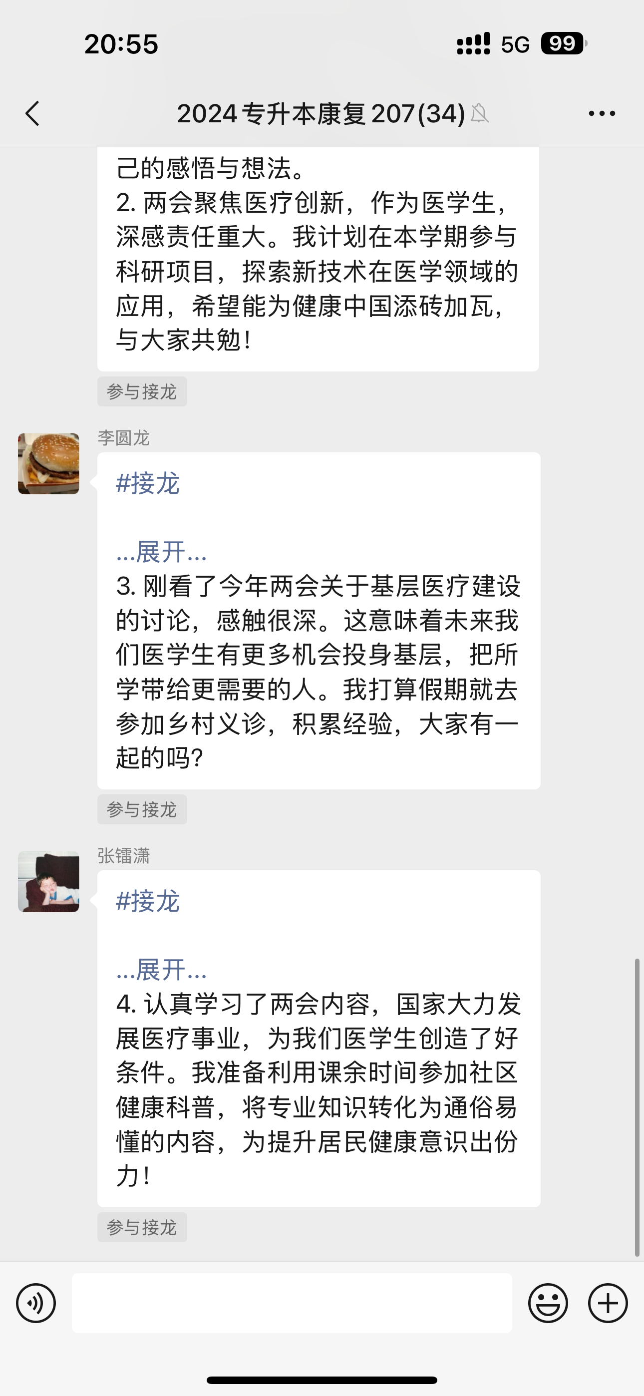 在“论两会热点,展青春风采”新媒体传播活动中,学生积极转发两会热词,各班级累计开展线上话题讨论56场,形成“医疗人才培养““智慧医院建设“等十大热点词云图,2024级康复治疗学专升本207班学生张镭潇表示:“身为医学生,最关注的还是医疗相关话题。看到国家大力推动智慧医疗发展,我也深受鼓舞,打算自学编程知识,探索如何将其与医学结合。未来已来,健康中国,我们一起努力!”