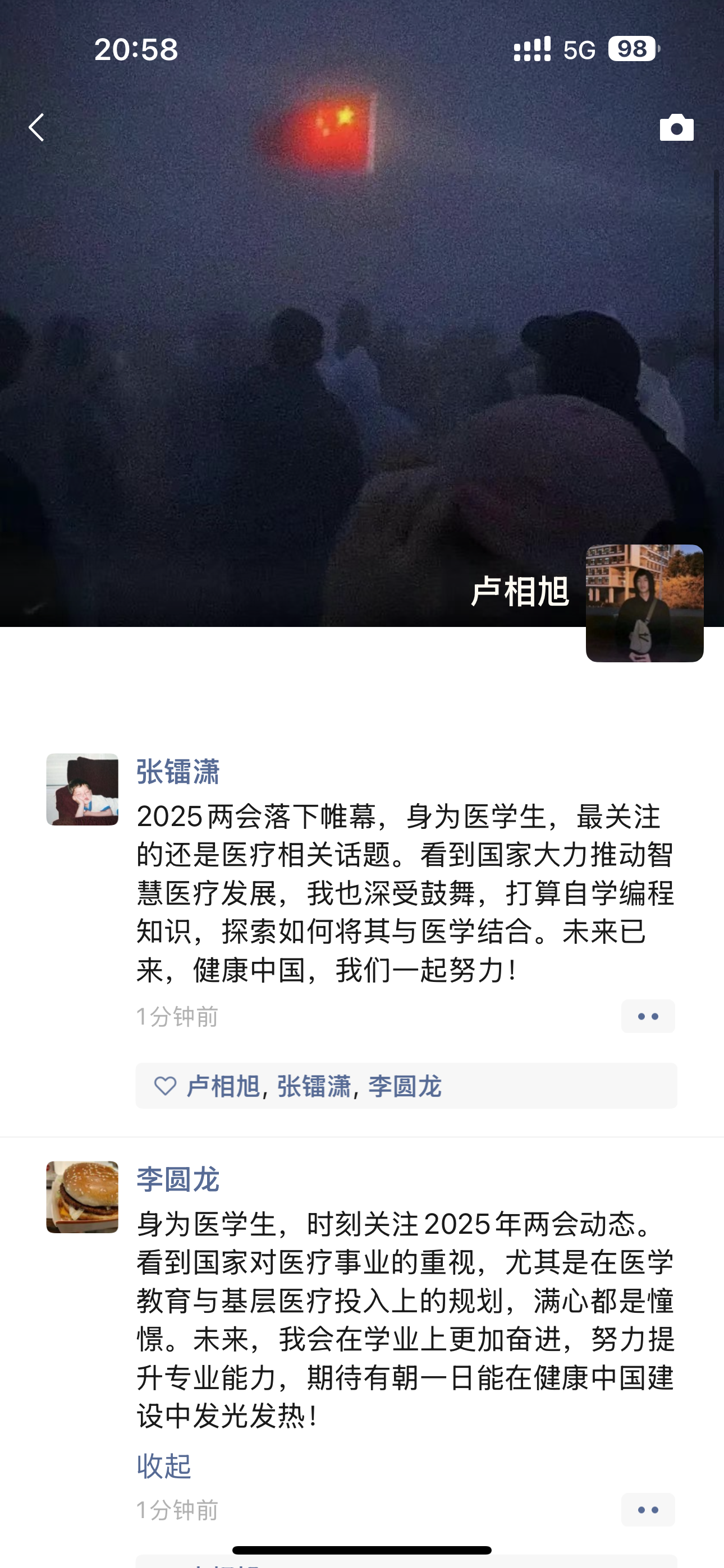 托新媒体平台,康复治疗学专业学生掀起“我为健康中国献一策”热潮。班级群内,学生围绕“2025年康复医疗新趋势”展开接龙讨论,提出“加强社区康复科普”“推动康复治疗纳入医保全覆盖”等建议50余条;微信朋友圈中,2024级学生发起“居家康复指导公益计划”倡议,号召同学利用假期为慢性病患者提供远程康复咨询,目前已吸引百余人响应。卢相旭留言到,两会提到“全生命周期健康管理”,康复治疗师就是生命的重建师,我们要让技术更有温度!”
