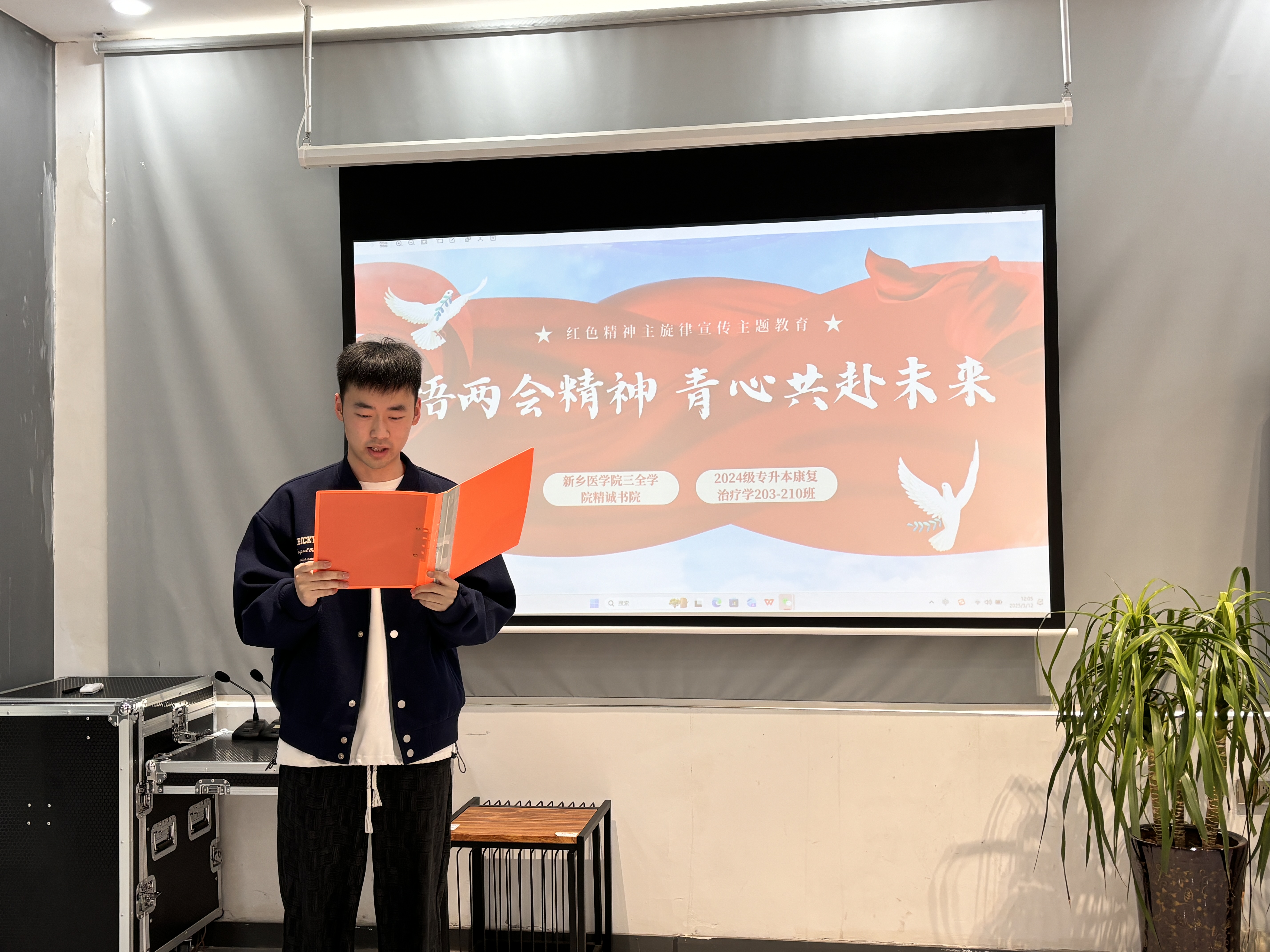 此次两会精神宣讲主题教育活动深度融入康复治疗学专业育人体系,既强化了学生的家国情怀,也激活了“以专业报国”的行动自觉。精诚书院党总支书记张新表示,未来将搭建更多康复实践平台,助力学生在“健康中国2030”征程中书写康复人的青春答卷。