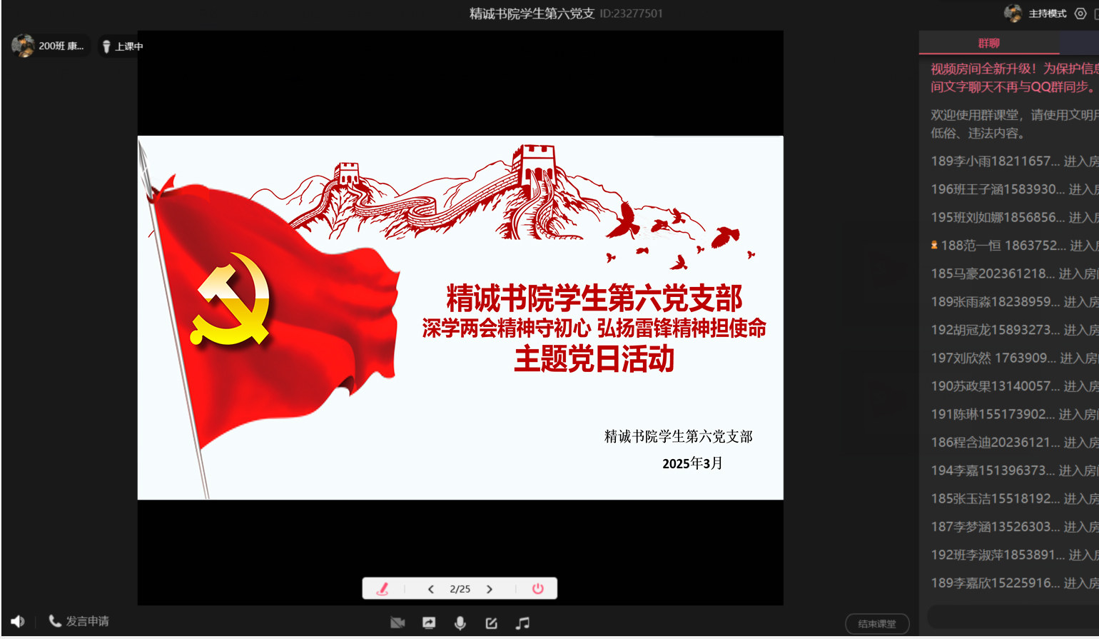 3月23日,精诚书院学生第六党支部在腾讯课堂开展了“深学两会精神守初心 弘扬雷锋精神担使命”主题党日活动。会议由党支部书记郝裴主持,支部全体学生党员参加。