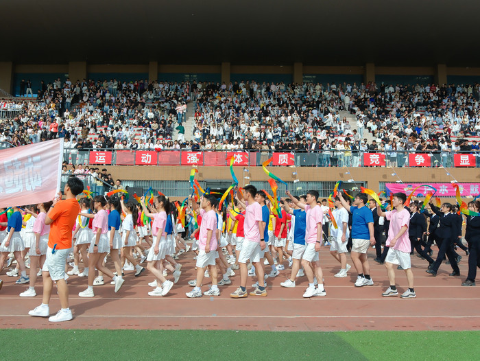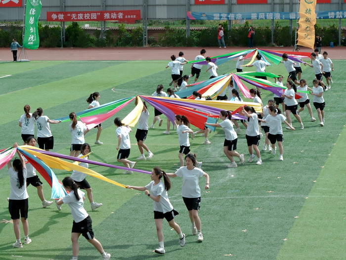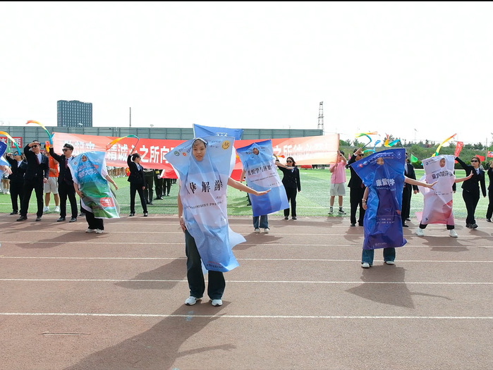 风貌与责任担当。该活动共计600余名学子参与展演。其中,140名表演者手持彩绸,汇聚成“四只圣洁鸽子”“医学十字”与“我爱中国”“全民运动”等字样,诠释医者对生命的敬畏与家国情怀的融合。400人方阵以铿锵动作拼出“东风41”图案,寓意精诚书院师生勇攀医学高峰的决心。火箭发射场景与彩烟绽放的梦幻画面,象征学子们将带着知识养分与医者初心,成为健康中国建设的中坚力量。