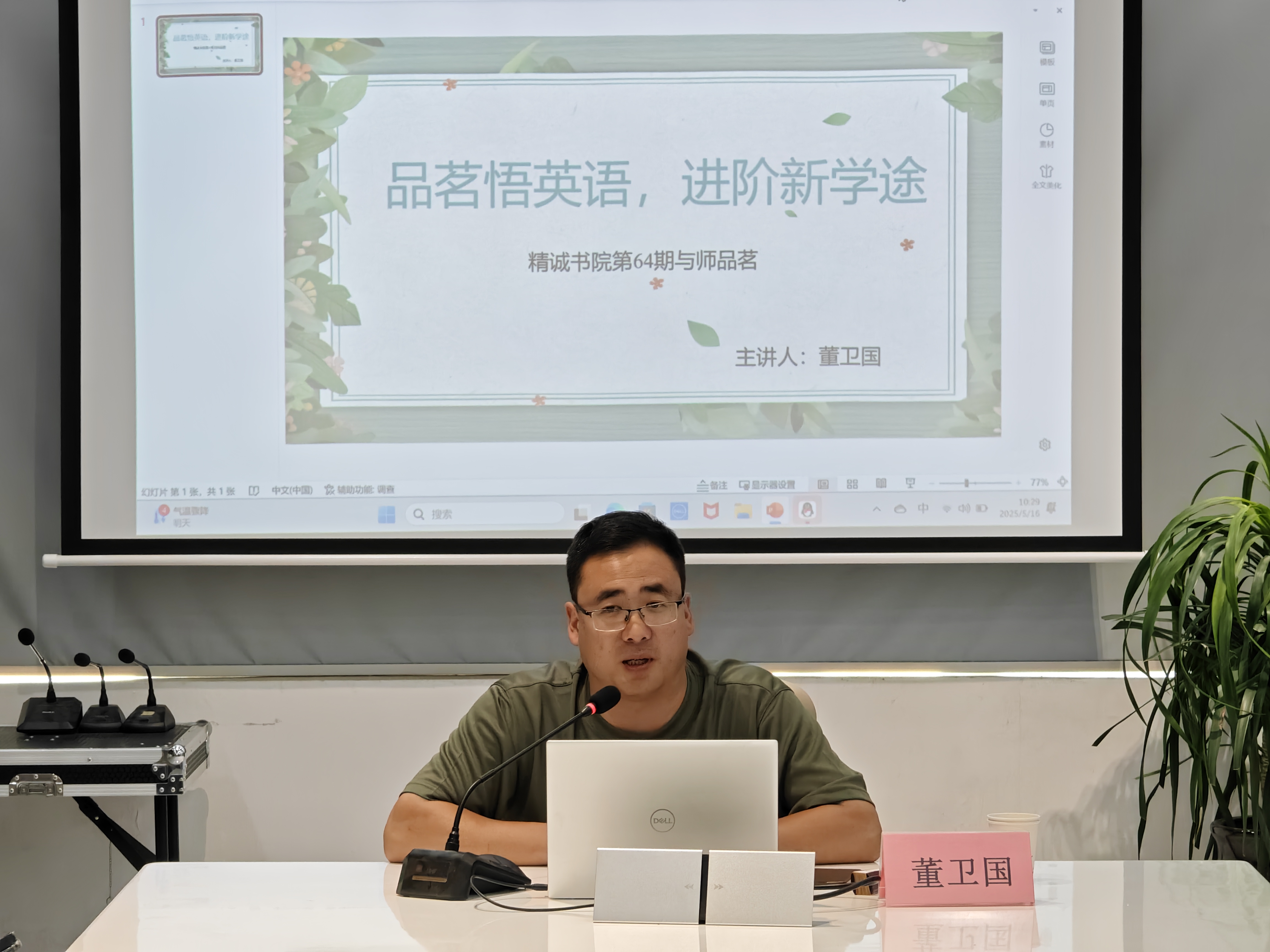 活动开场,主持人介绍活动背景与流程后,董卫国以自身多年英语教学与学习经验为切入点,围绕“高效英语学习路径探索”展开分享。他谈到:“英语学习并非机械记忆,而是要将语言融入生活,以兴趣为引,在主动探索中积累知识。”针对学生普遍存在的单词记忆难题,董卫国提出“语境记忆法”,倡导通过阅读英文原著、观看英文纪录片等方式,在实际语境中理解并掌握词汇;在英语听说能力培养方面,他强调“沉浸式学习”的重要性,鼓励学生大胆开口,克服“哑巴英语”。详实且实用的分享内容,赢得现场阵阵掌声。