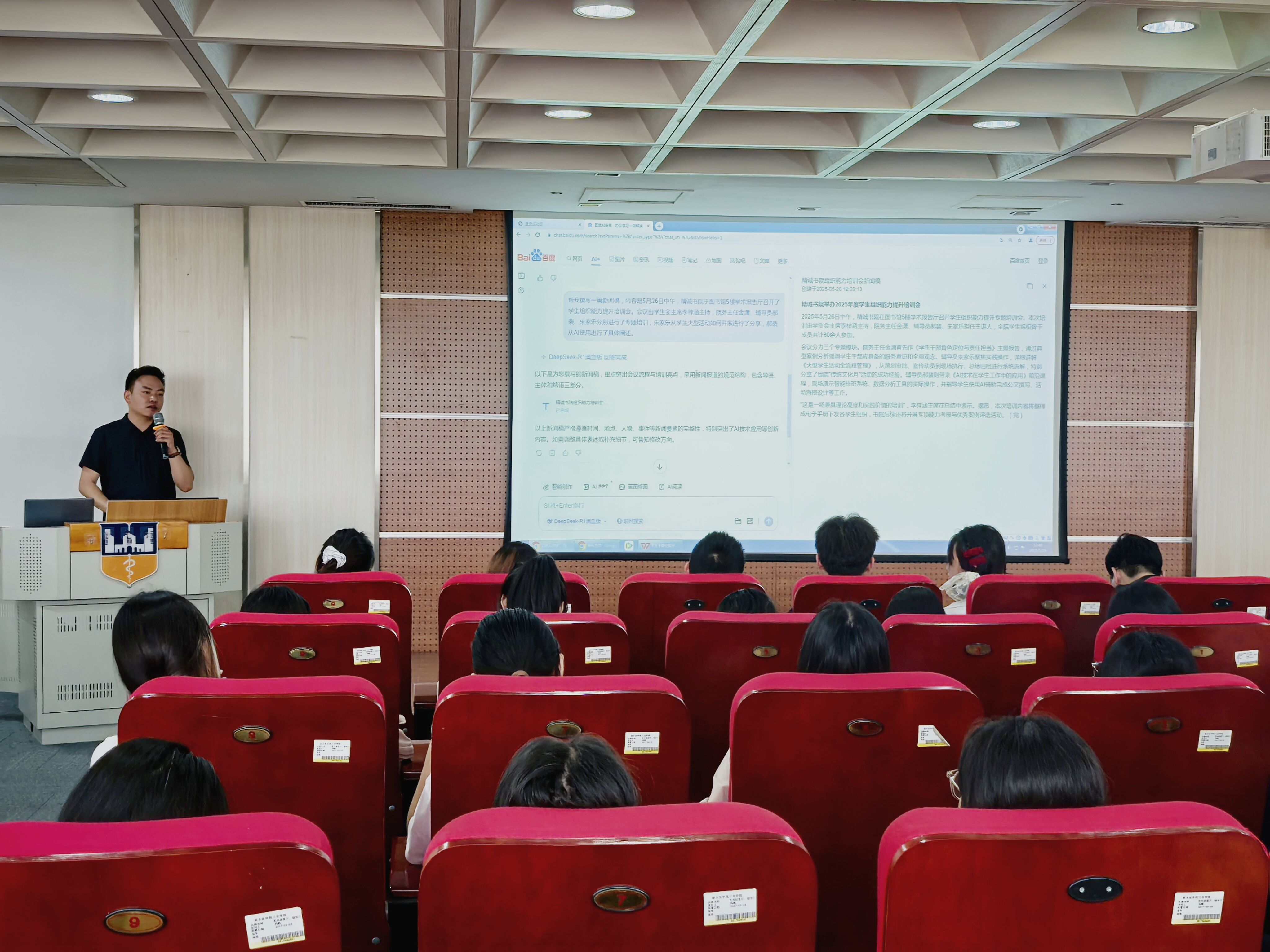 5月26日中午,学生干部专题培训在图书馆五楼学术报告厅举行。行政专员朱家乐老师以团体操、方块队为例,从前期筹备、中期执行到后期总结,完整讲解了大型活动的组织流程。辅导员郝裴现场演示了如何运用AI工具提升工作效率,包括智能写作、数据分析和流程优化等功能。院务主任金潇在总结中强调,学生干部要“爱学习、强信念、重服务、善创新、有格局”,在服务同学中锤炼本领、提升素养。他结合鲜活案例指出,学生工作不仅是奉献,更是成长的舞台,唯有脚踏实地、躬身实践,才能在服务中实现个人价值,在担当中成就卓越自我。