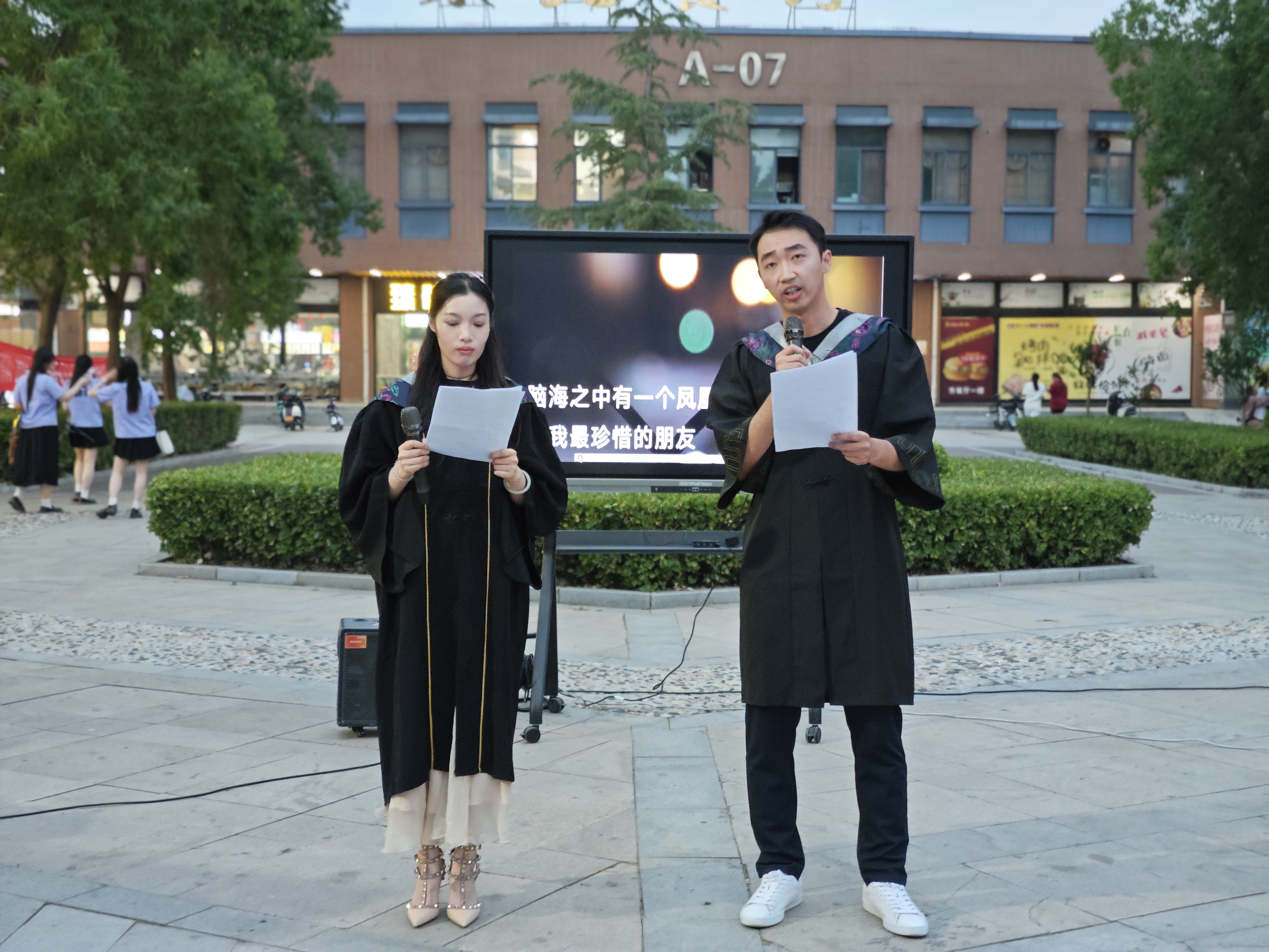 6月5日晚,“星空音乐会”毕业之夜在书院广场温情上演。开场,毕业生李佳怡以一曲《带我去很遥远的地方》热舞点燃全场,随后,毕业生刘则权、吕靖雯走上舞台,深情朗诵《青春》,字句间流淌着对往昔的眷恋与对未来的祝福。教师团队合唱的《海阔天空》把晚会推向高潮。当熟悉的旋律响起,全场瞬间化作一片闪光灯的海洋,老师们眼中盛满温柔,歌声里是对学子们最真挚的期许:“原谅我这一生不羁放纵爱自由,也会怕有一天会跌倒……”台下的同学们眼含泪光,齐声合唱,歌声里满是对未来的期许与不舍。特别设置的“星空告白”环节更成为情感纽带,那些未曾说出口的感谢与心意在夏夜星空下温暖流淌,化作永恒的青春印记。