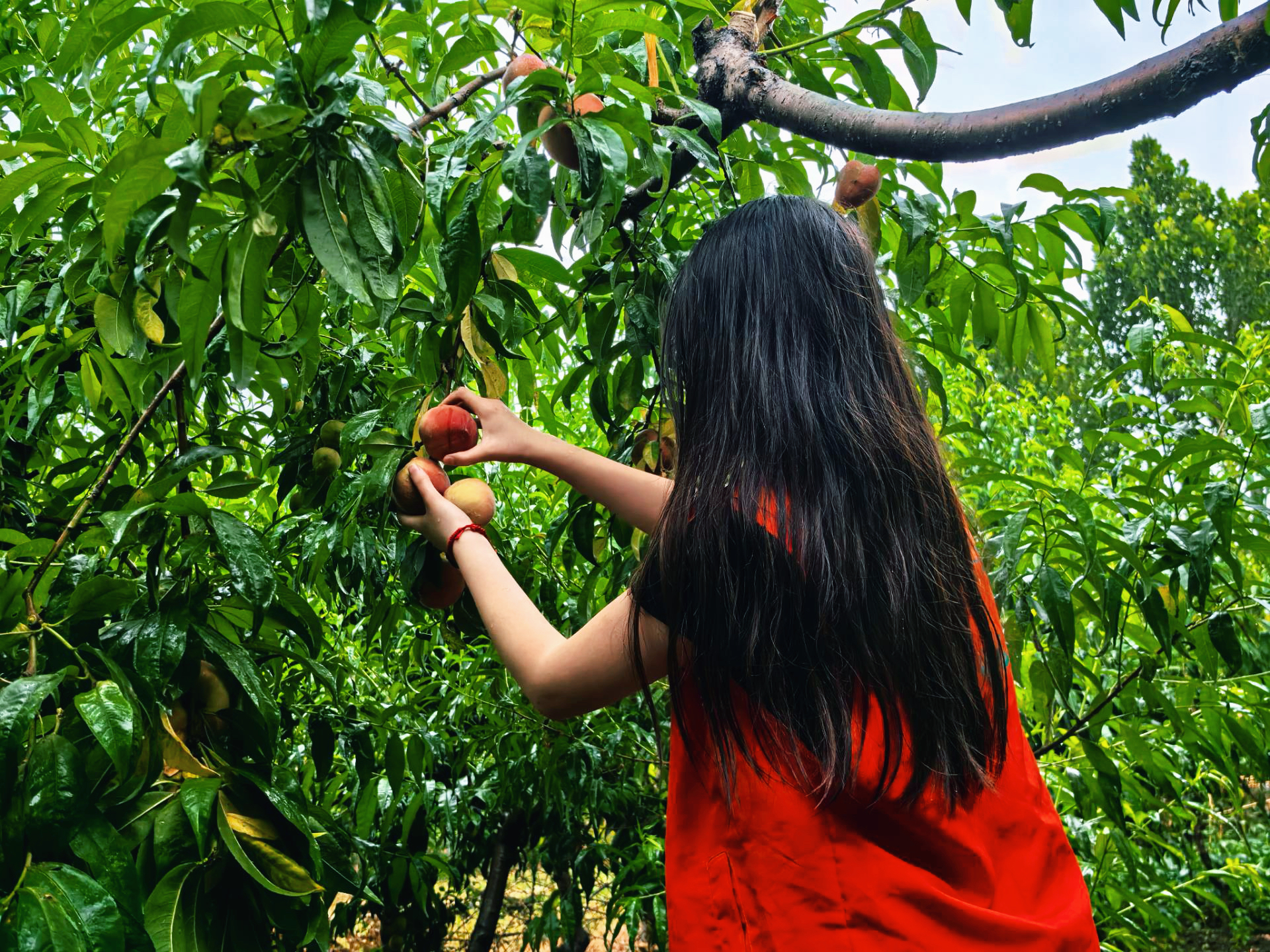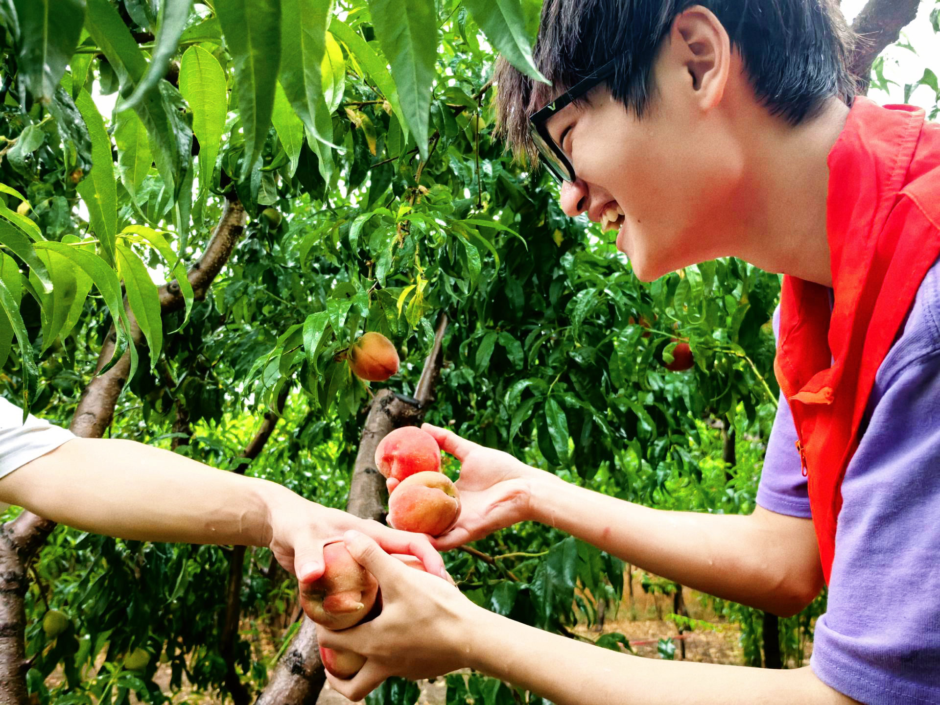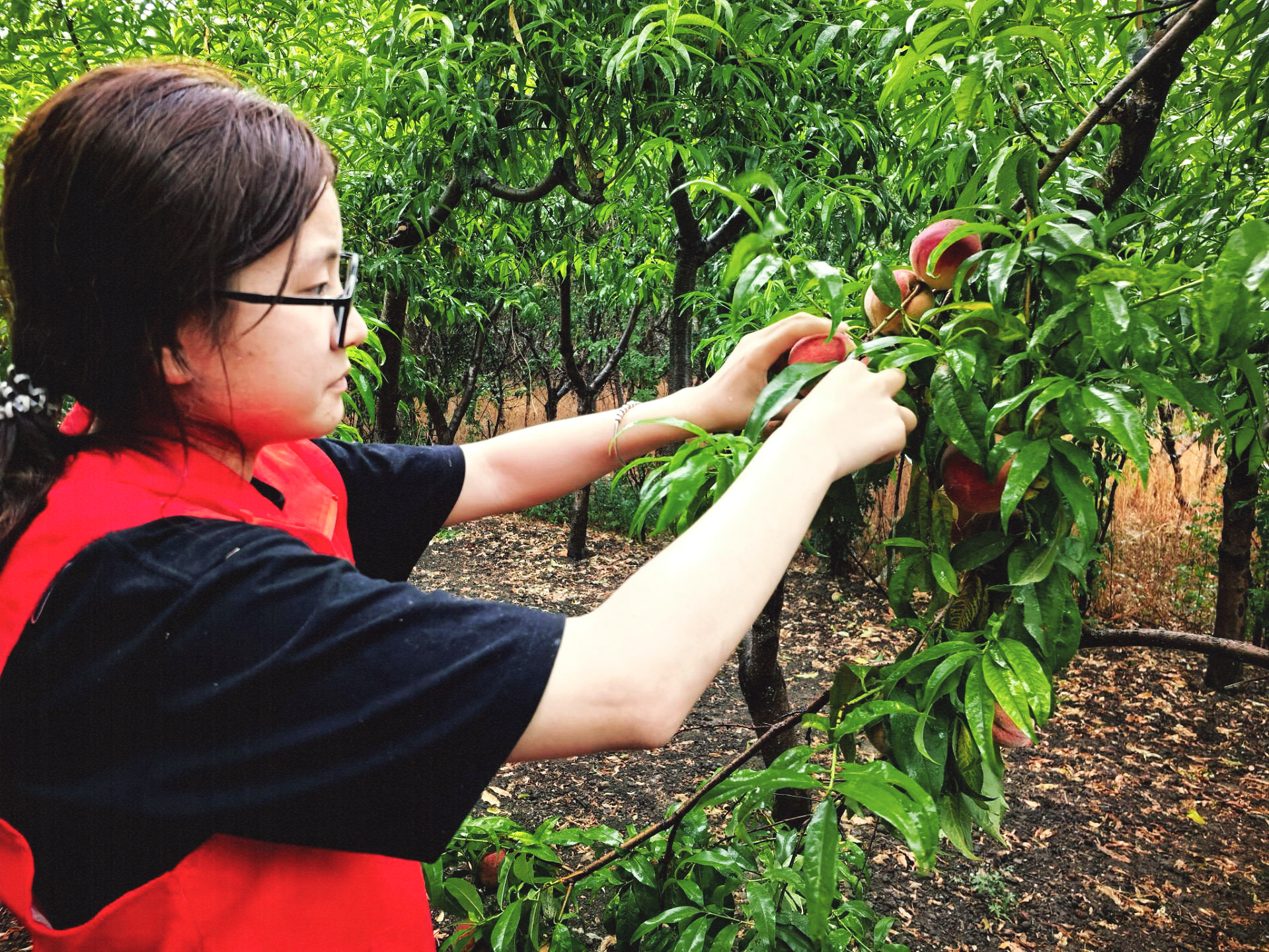 面对这一困境,实践团提前与村委对接,结合桃园分布、果树高度等特点,将队员分为“登高采摘组”“传递转运组”“技术指导组”。专业种植户出身的志愿者张纯祥主动担任“技术顾问”,踩着折叠梯站在树旁示范:“采摘要托住果实中下部,手腕轻旋让果柄自然脱落,这样既保果又不伤树。”在他的指导下,志愿者们配合默契——高处的桃子由“登高组”精准摘取,树下“传递组”接力轻放至竹筐,全程避免碰撞挤压。3小时内,2亩桃园的采摘任务完成90%,800余斤毛桃被有序转运至临时仓储点。