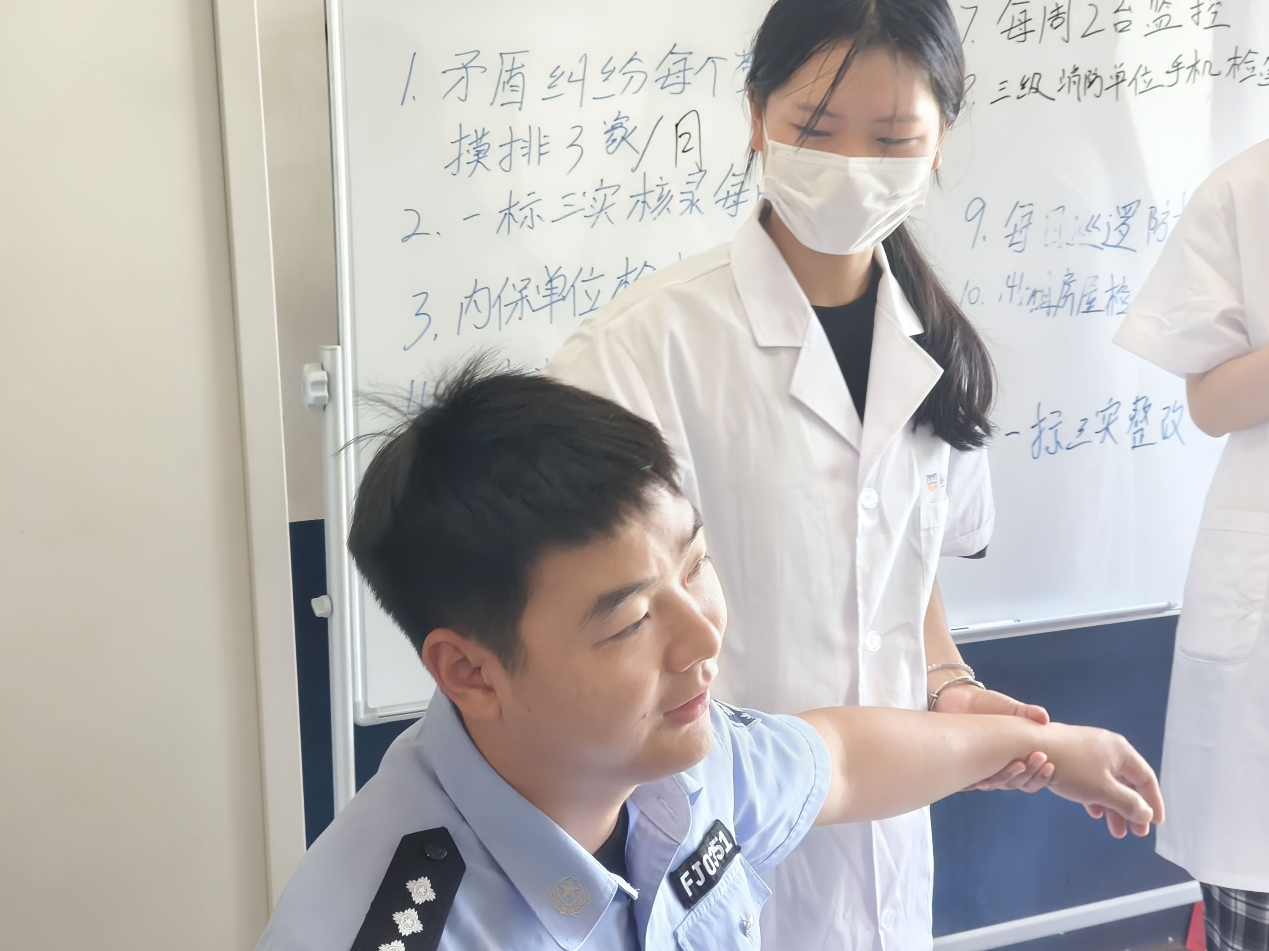 康复功能评定区同样热闹非凡,康复治疗学专业的志愿者们凭借丰富的专业知识和经验,仔细评估警务人员因长期站岗、伏案工作引发的肩颈、腰椎问题。不仅现场示范颈部拉伸、腰部放松等简单易学的康复动作,还手把手指导大家如何利用工作间隙进行自我调理,帮助他们缓解身体疲劳。