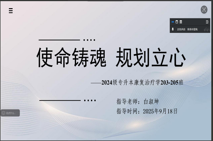 9月18日,学业导师白淑坤以线上形式,为康复治疗学2024级203—205班学生开展“使命铸魂 规划立心”主题学业指导。活动围绕三大核心:一是解读康复治疗学专业与社会发展、民族复兴的关联,引导学生树立“学业服务国家”意识,破解学习动力缺失问题;二是梳理学业发展思路,明确各阶段重点,解答“学什么”“怎么学”“往哪走”的困惑;三是针对考研、就业不同意向,分别提供院校选择、复习规划及简历制作、面试技巧等指导,助力学业与职业无缝衔接。学生表示,此次活动既树立了使命意识,也清晰了职业路径,为长期发展奠定基础。