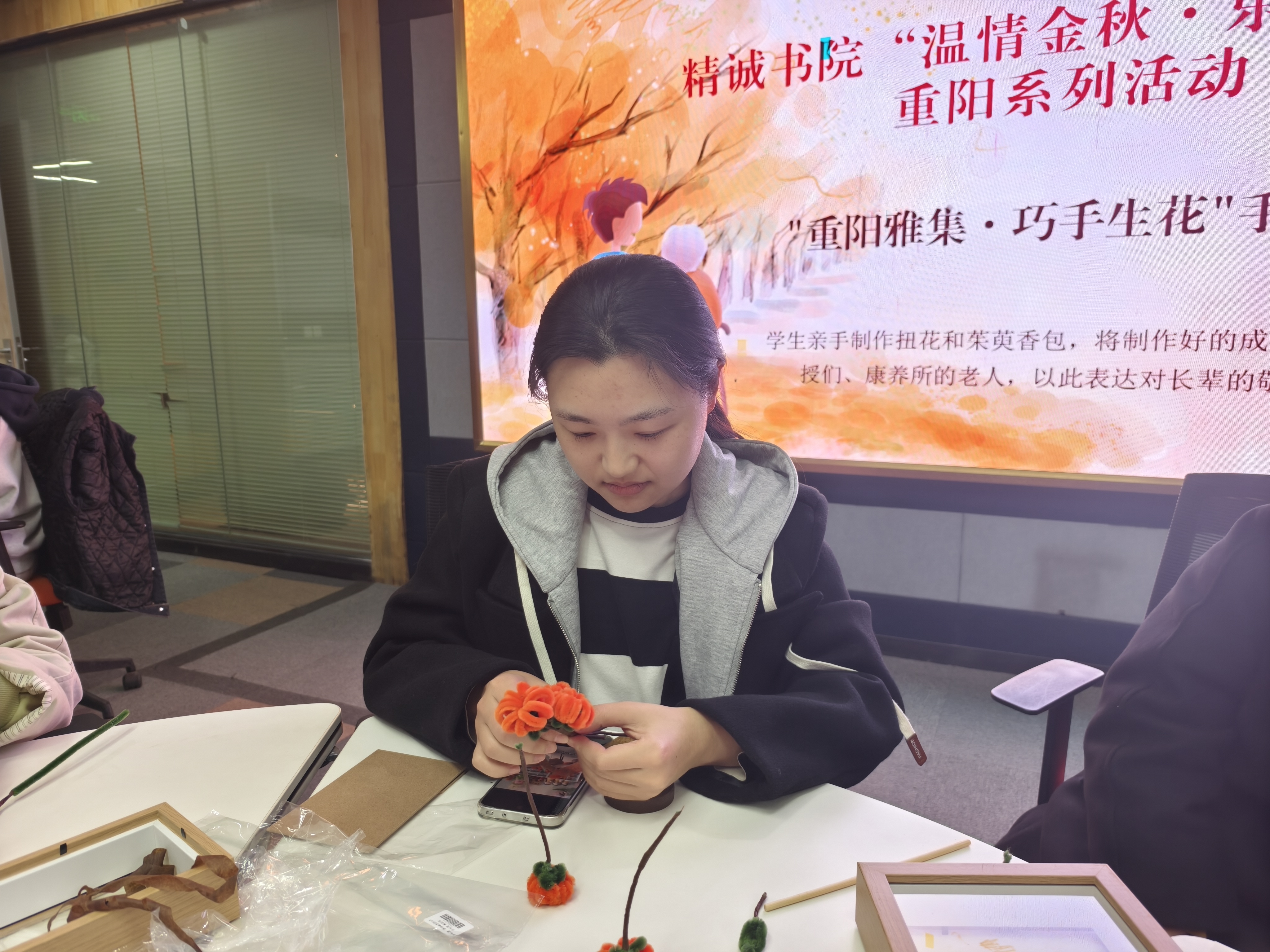 10月27日,精诚书院党委在众创空间继续开展“重阳雅集,巧手生花”手工工作坊活动。