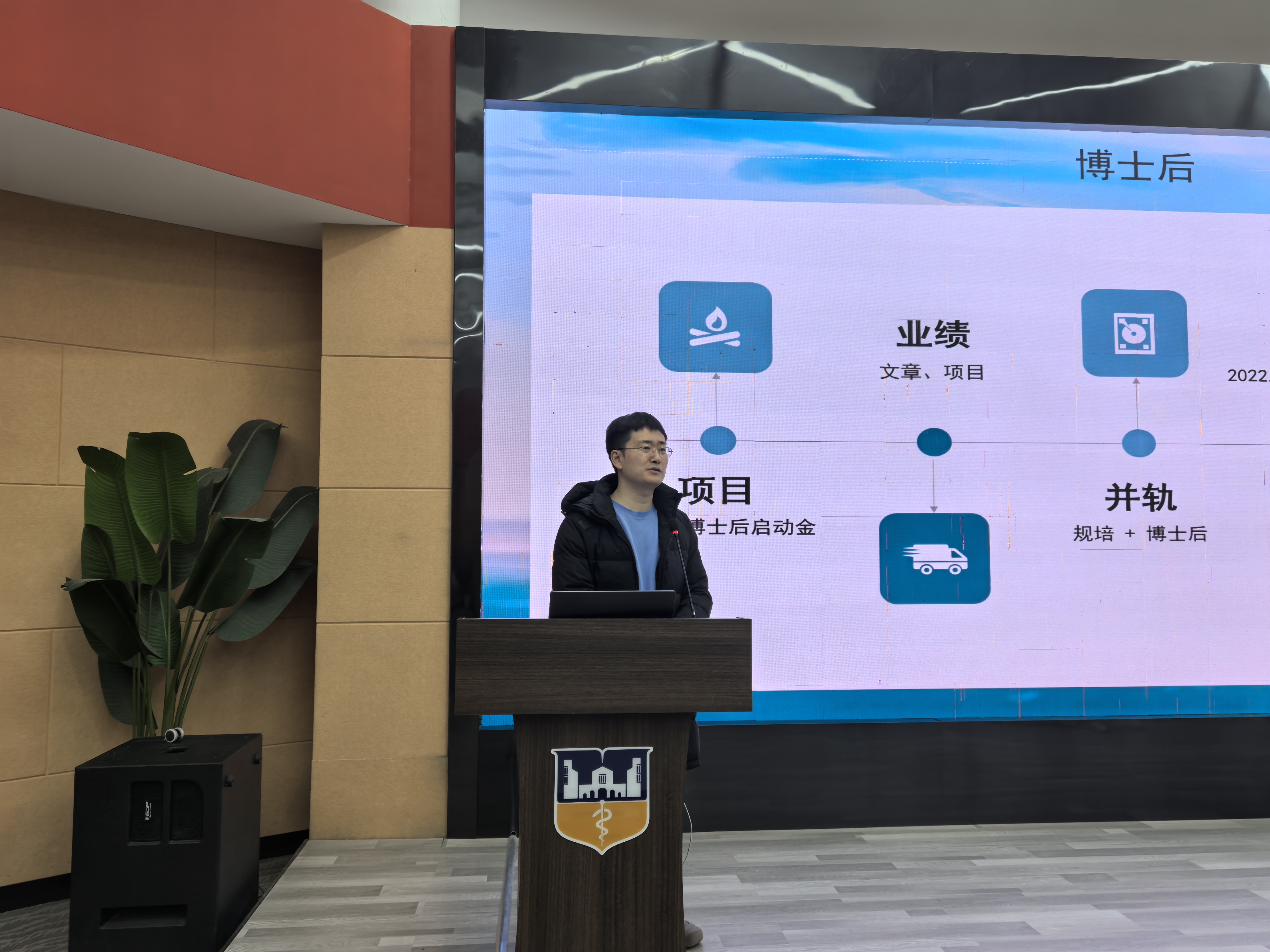 分享环节中,史阳校友结合自身求学经历,用真挚朴实的语言讲述了自己的医学逐梦之路。他回忆了在豫才医学院本科阶段的学习时光,坦言正是母校严谨的治学氛围、老师们的悉心指导,为他打下了坚实的临床医学基础。他分享了自己在考研、考博及博士后研究过程中遇到的困难与挑战,从如何平衡临床实践与理论学习,到如何培养科研思维、开展实验研究,再到面对挫折时的心态调整,都毫无保留地倾囊相授。
