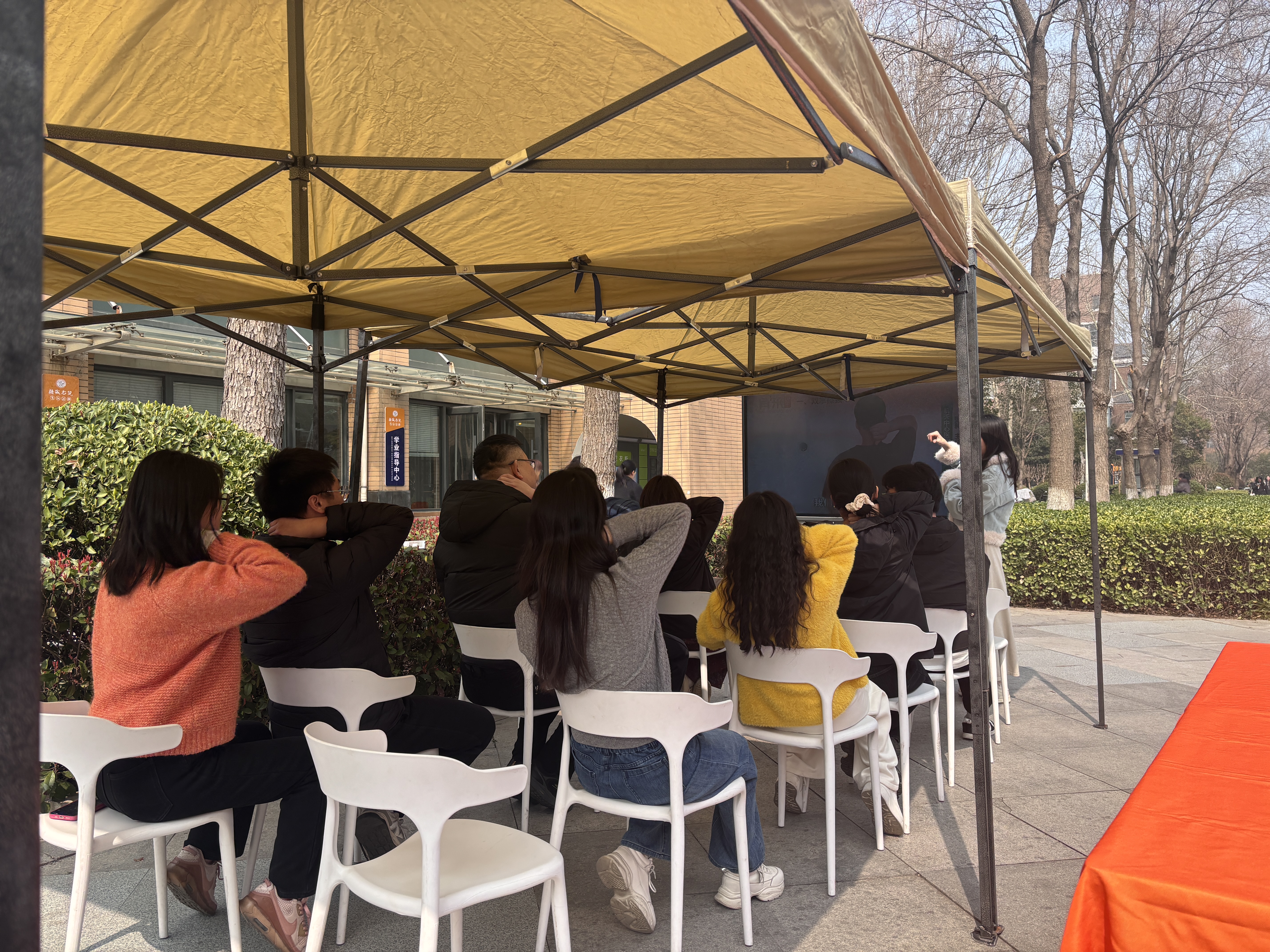 发放宣传单环节结束后,康复医学院教师盛雯静通过视频讲解的方式,带领大家现场学习了预防保健活动操。从颈部拉伸、肩部环绕到腰部扭转、腿部放松,一套动作下来,简单易学且针对性强。“这个动作每天做几次,能有效缓解久坐带来的腰部酸痛。”随着音乐的节奏,师生们纷纷跟着视频和盛老师的示范动起来,现场气氛十分活跃。一套操做下来,大家都感觉身体得到了舒展,疲惫感也减轻了不少。