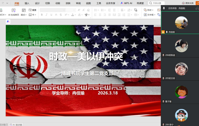 3月18日,两场特色学业指导活动同步开展。上午,外国语学院仝庆老师在大学生众创中心,为2025级外语兴趣社学生带来大学英语四六级专题指导。仝老师总结上学期学习情况,结合本学期课程安排帮助学生制定可落地的学期学习计划,详细讲解英语四级报名流程与备考要点,鼓励学生提前备战,提升英语学习积极性与应试能力。同日,冉佳瑜老师通过腾讯会议,为精诚书院学生第二党支部,以“美以伊冲突”为主题开展时政热点指导,拓展学生国际视野,引导学生辩证分析国际事件,增强家国情怀与理性思维,实现思政教育与学业指导深度融合。