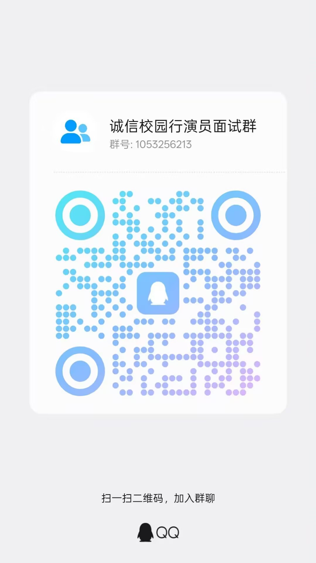 演员报名:扫码进QQ群「诚信校园行面试群」,群号:1053256213