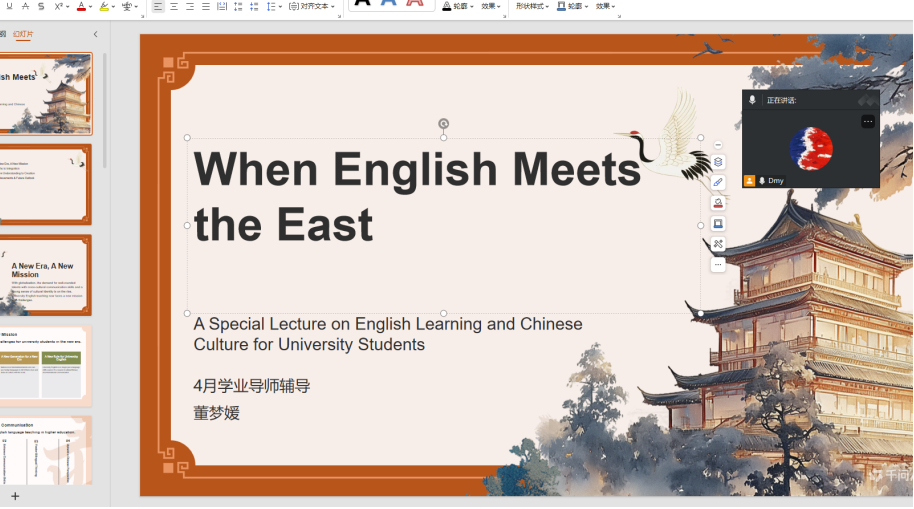 4月7日,董梦媛通过腾讯会议,为2023级社区康复7班带来“英语遇见东方”特色指导。活动立足康复专业国际化发展需求,引导学生将中华优秀传统文化融入英语学习,鼓励学生在演讲与写作中融入东方智慧。互动环节中,董梦媛针对性解答“专业英语与传统文化词汇积累”等问题,推荐《中医英语》《中国文化英语教程》等学习资料,建议学生建立个人双语语料库,在提升语言应用能力的同时增强文化自信。